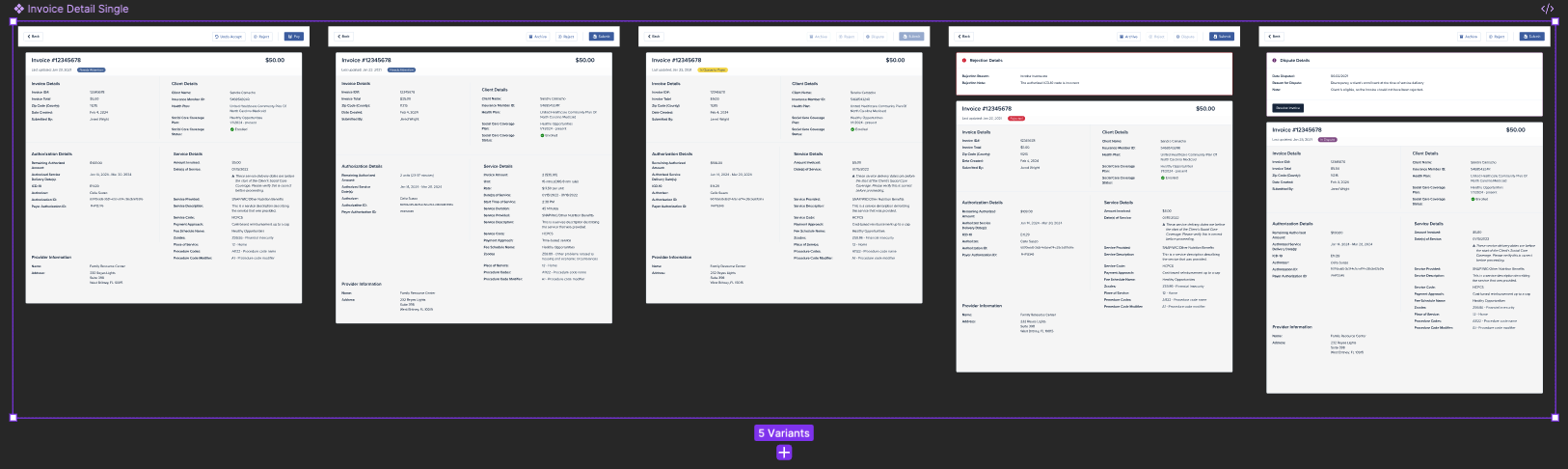 One key pattern was Invoice Details, designed as a reusable composite with clear variants by user role and invoice state. For example, a Disputed Invoice variant includes an additional dispute summary section above the standard invoice fields.By standardizing these variants in one place, we reduced the risk of small spec differences (like a missing field or mismatched label) that can create confusion in implementation and QA.